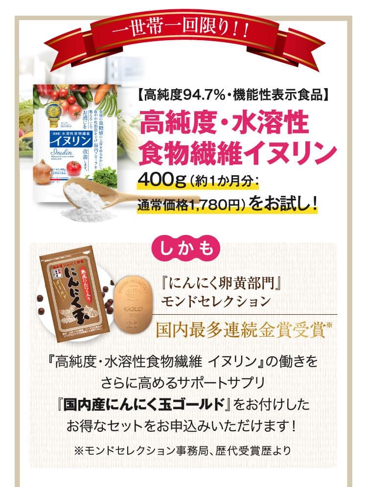 一世帯一回限り!!【高純度94.7%・機能性表示食品】高純度・水溶性食物繊維イヌリン